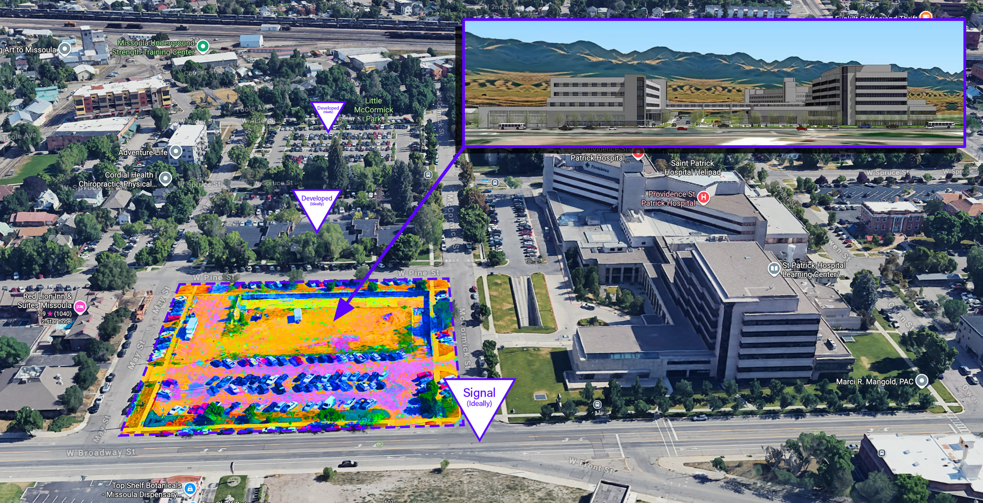 Sadly development of a medical building never came in 2019/2020 due to the pandemic. Since then the hospital has shifted gears in a variety of directions. Similar to the Riverfront Triangle, which this is basically a part of, they city should partner with the hospital to build some form of parking structure couple with commercial. It could be blank office style floors allowing for private or medical to fill the space. This would allow for the most flexibility. Another goal would be to reduce and reuse the surface lots. If enough space is gained in the new structure, then old lots could be developed. All of this helping to better utilize the area.